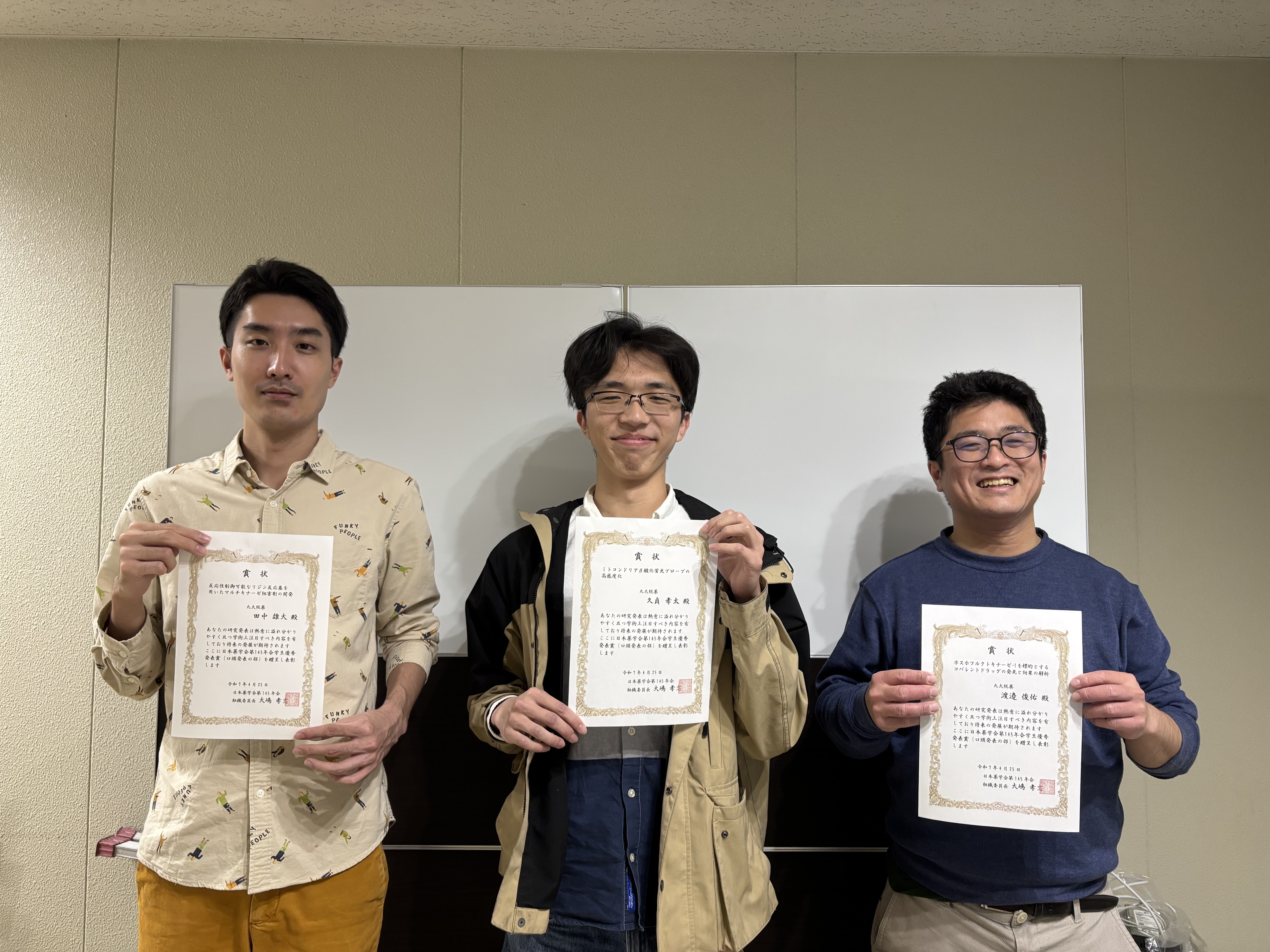田中雄大さん(発表当時D1)が日本薬学会第145年会(福岡)にて学生優秀発表賞を受賞しました。おめでとうございます。 演題名: 反応制御可能なリジン反応基を用いたマルチキナーゼ阻害剤の開発