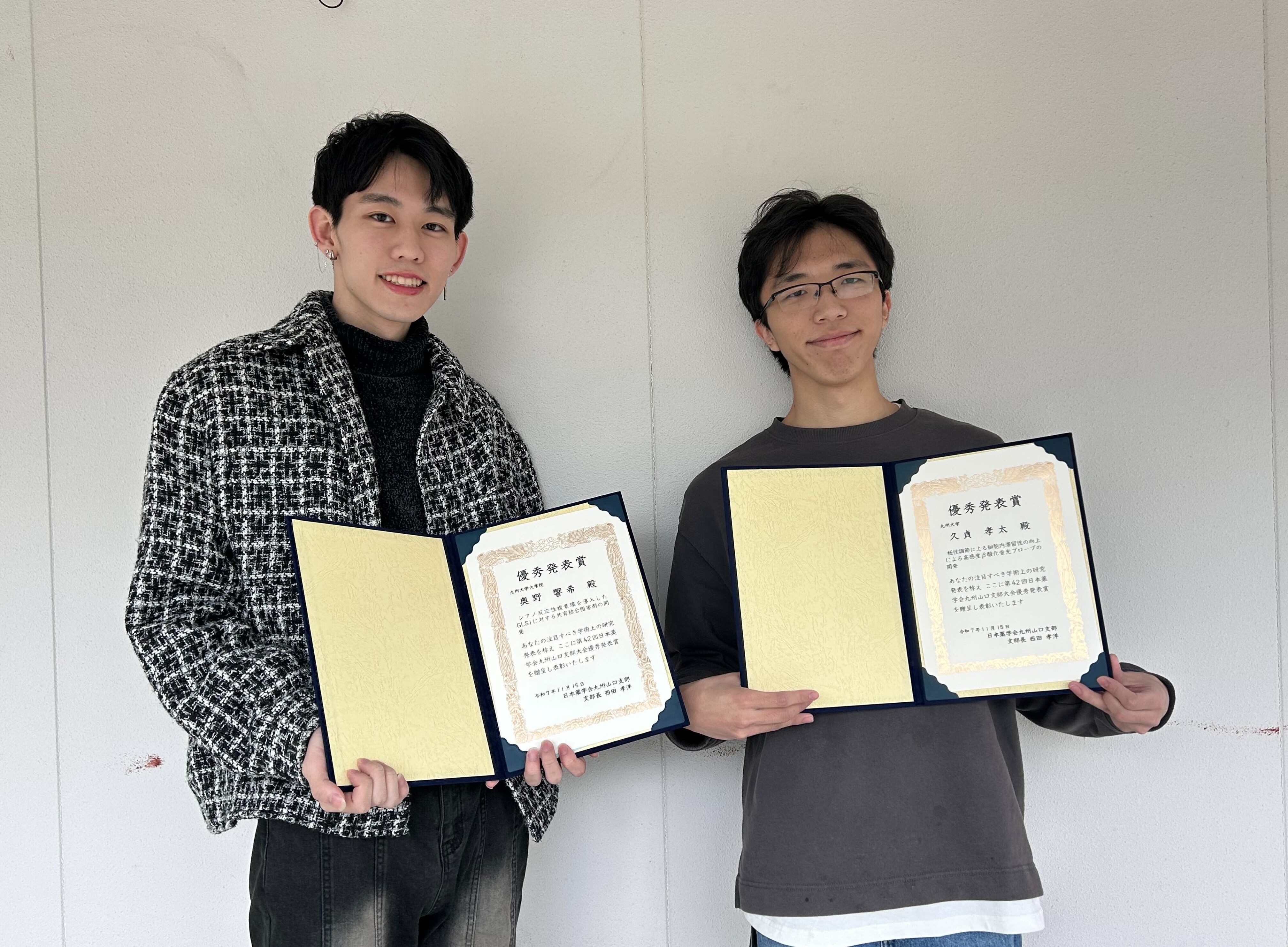 久貞孝太さん(M1)が第42回日本薬学会九州山口支部大会(長崎)にて優秀発表賞を受賞しました。おめでとうございます。 演題名: 極性調節による細胞内滞留性の向上による高感度β酸化蛍光プローブの開発